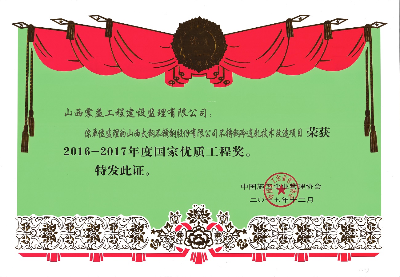 公司先后承擔(dān)了冶金、機(jī)械、電力、礦山、市政、環(huán)保、房屋建筑等工業(yè)及民用建設(shè)大中型工程項(xiàng)目1000余個(gè),足跡遍及國內(nèi)二十多個(gè)省市,在全國各地四千余個(gè)制造廠家進(jìn)行了駐廠設(shè)備監(jiān)理,工程監(jiān)理也立足省內(nèi)輻射全國多個(gè)省區(qū)乃至國外。多年來,我們憑著嚴(yán)格監(jiān)理、優(yōu)質(zhì)服務(wù)的工作作風(fēng)贏得業(yè)主的信任和好評,受監(jiān)工程質(zhì)量合格率均為100%。由我公司監(jiān)理的太鋼7.63m焦?fàn)t(及配套化產(chǎn))工程、450㎡燒結(jié)工程、4350m3高爐工程、400萬噸煉鋼/連鑄工程、2250mm熱軋工程、新不銹鋼冷軋工程、熱軋加熱爐工程、冶煉廢水處理工程、BOC制氧工程、40萬噸及50萬噸不銹鋼冷軋工程、制鐵煉鋼節(jié)能減排660㎡燒結(jié)機(jī)工程、不銹鋼冷軋光亮板結(jié)構(gòu)調(diào)整工程、型材系統(tǒng)改造一期徑鍛機(jī)工程、加工廠礦渣超細(xì)粉二期工程、2250mm熱連軋罩式爐工程、2250mm熱連軋新建鋼卷表面處理線工程、袁家村鐵礦項(xiàng)目、不銹冷連軋技術(shù)改造工程、硅鋼冷連軋技術(shù)改造工程等等多項(xiàng)工程項(xiàng)目均獲得了“冶金工業(yè)優(yōu)質(zhì)工程”獎(jiǎng);日貸清潔生產(chǎn)90噸電爐工程獲山西省“汾水杯”質(zhì)量獎(jiǎng);太原濱河小區(qū)、19宿舍、太鋼2*300MW自備電廠、太原市不銹鋼工業(yè)園區(qū)等工程獲太原市“******文明施工樣板”工地;太鋼不銹2*300MW自備電廠改擴(kuò)建煙筒構(gòu)筑物工程、太鋼2*300MW空冷供熱機(jī)組儲煤筒倉建筑工程、山西太鋼不銹鋼科技冷軋精密帶鋼工程等獲“山西省優(yōu)良工程”;1350 m3高爐、400萬噸煉鋼/連鑄工程獲得******建設(shè)工程“魯班”獎(jiǎng)、不銹冷連軋技術(shù)改造工程獲“******優(yōu)質(zhì)工程獎(jiǎng)”。太鋼150萬噸不銹鋼系統(tǒng)工程同時(shí)獲******“建國60年來經(jīng)典暨精品工程”獎(jiǎng)、“******優(yōu)質(zhì)工程金質(zhì)獎(jiǎng)”、******工程建設(shè)“魯班”獎(jiǎng)三項(xiàng)大獎(jiǎng)。